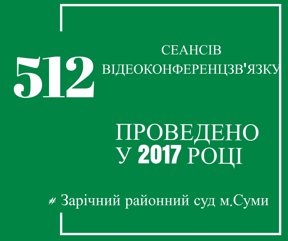 В Зарічному районному суді м. Суми активно використовуються можливості відеоконференцзв’язку. Протягом 2017 року проведено 512 сеансів, з яких 476 з іншими судами та 36 з установами Державної пенітенціарної служби України.