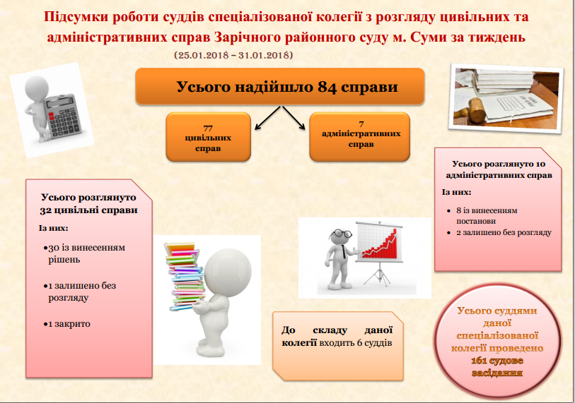 З метою здійснення контролю за станом розгляду справ головний спеціаліст по роботі зі зверненнями громадян та юридичних осіб Зарічного районного суду м. Суми Юлія Попович щотижня готує інформацію щодо призначення та розгляду справ суддями спеціалізованих колегій.