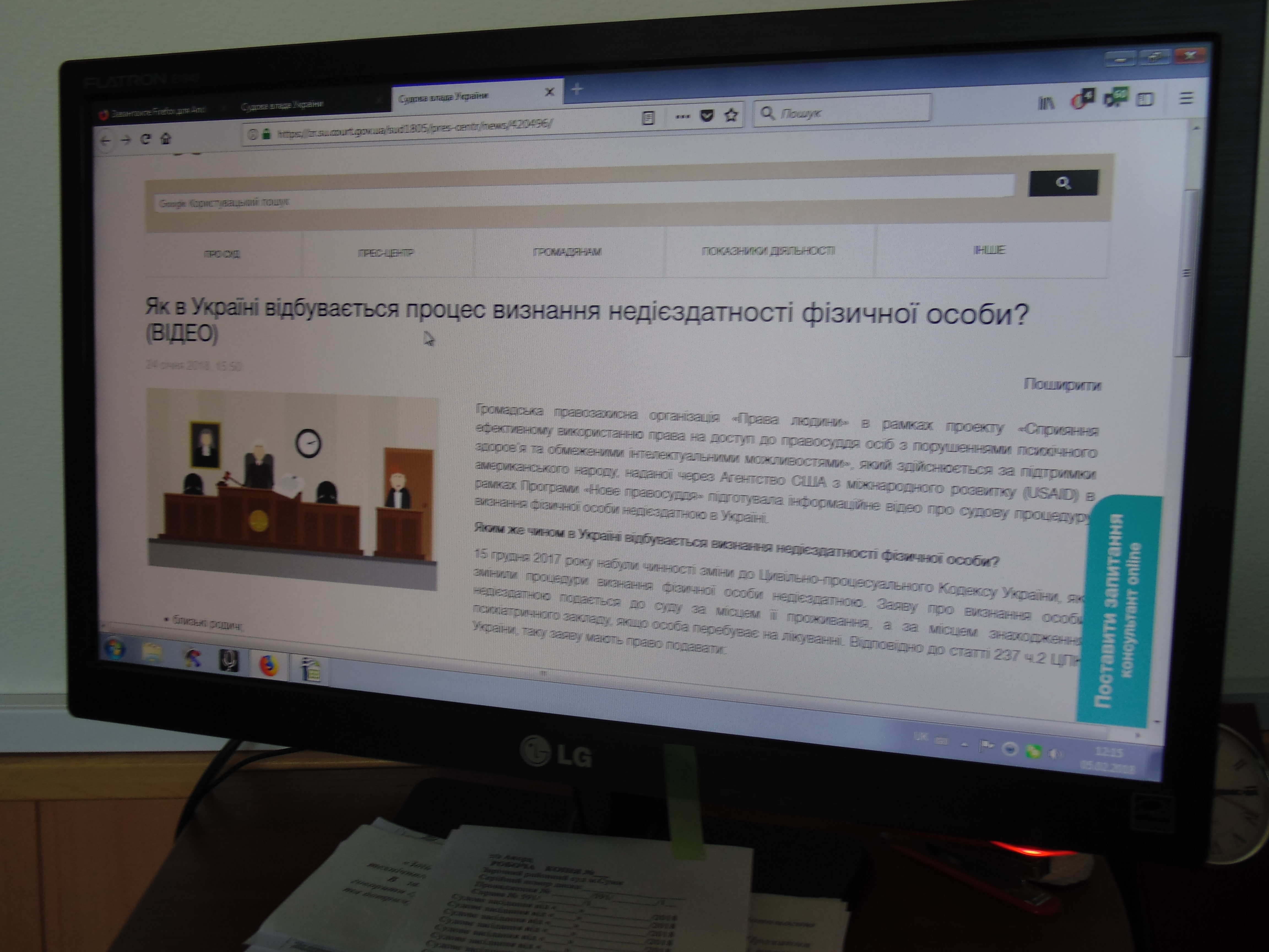 Переглянули усі присутні й інформаційне відео про судову процедуру визнання фізичної особи недієздатною в Україні, яке підготовлено Громадською правозахисною організацією «Права людини» в рамках проекту «Сприяння ефективному використанню права на доступ до правосуддя осіб з порушеннями психічного здоров’я та обмеженими інтелектуальними можливостями», який здійснюється за підтримки американського народу, наданої через Агентство США з міжнародного розвитку (USAID) в рамках Програми «Нове правосуддя».