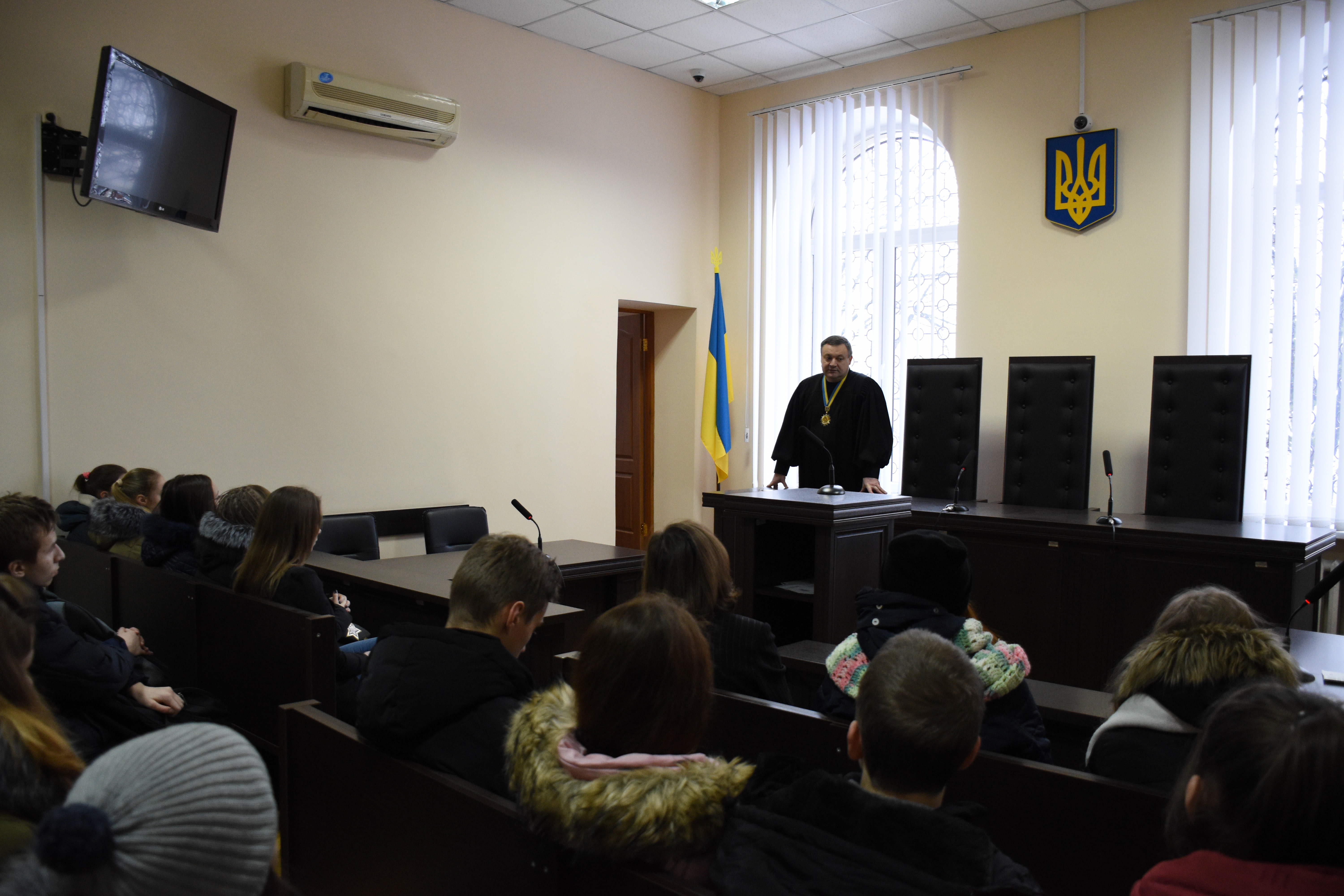 Найцікавішою частиною екскурсії звичайно стала зустріч із суддею. З гімназистами залюбки поспілкувався суддя Апеляційного суду Полтавської області Володимир Костенко. Діти дізналися хто може стати суддею в Україні, як розглядаються справи в апеляційній інстанції, як учасники процесу розташовуються в залі судового засідання. Більш детально суддя зупинився на відповідальності неповнолітніх.