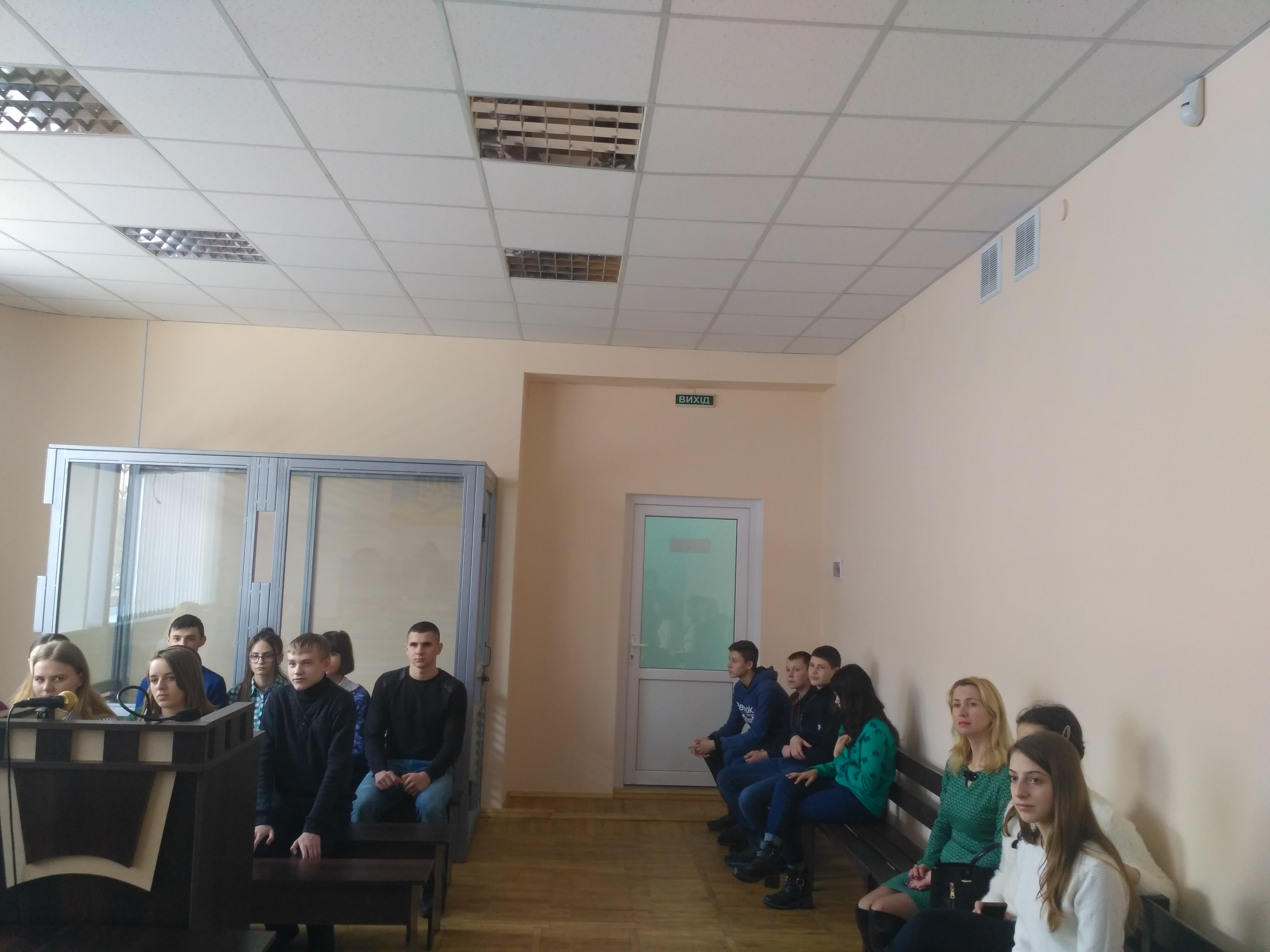Першим кроком цього ознайомлення стало відвідування зали судового засідання, де з учасниками заходу провів бесіду голова суду Шелюховський М.В., який одразу ж запросив до себе у крісло судді старосту класу. Він розповів про роботу судді, категорії справ, які розглядаються в місцевих судах, про загородження, яке відокремлює обвинувачених (підсудних), засуджених від складу суду та присутніх, що відповідає європейським стандартам, про розгляд справ за участі присяжних та ін. Дав відповіді на запитання дітей та вчителя.