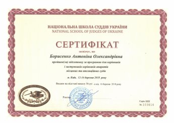 Керівник апарату суду Антоніна Борисенко з 12 по 16 березня 2018 року пройшла підготовку керівників і заступників керівників апаратів місцевих та апеляційних судів Вінницької, Житомирської, Київської, Черкаської, Чернігівської областей та міста Києва в Національній школі суддів України в місті Києві.