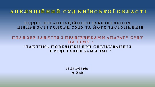 Начальником відділу організаційного забезпечення діяльності голови суду та його заступників Алімовою О.М. та помічником заступника голови суду Бражник Н.М. 30 березня 2018 року підготовлено та проведено планове заняття з працівниками апарату суду на тему: "Тактика поведінки при спілкуванні з представниками ЗМІ".