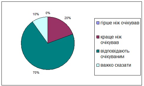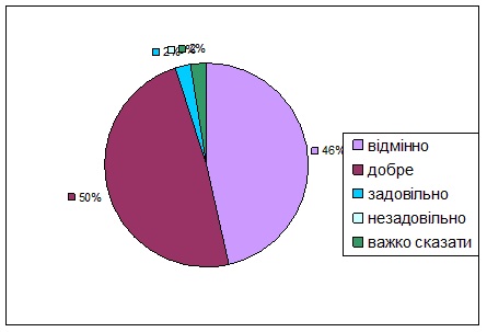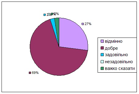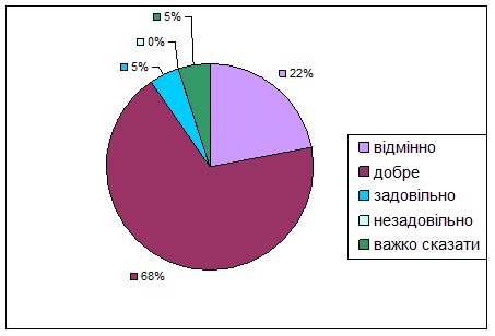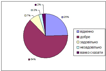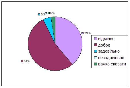 Оцінки розподілилися наступним чином: «відмінно» - 10 осіб (25%), «добре» - 26 осіб (64%); «задовільно» - 2 особи (13%); та 1 особа (7%) вказала оцінку «відмінно».
