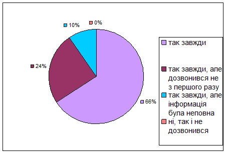 Завжди додзвонювались до Добропільського міськрайонного суду Донецької області 27 осіб ( 66%) опитаних; завжди додзвонювалися, але не з першого разу - 10 особи (24%); не додзвонилися -0 осіб (0%); 4 особи віднесли свою відповідь до категорії «дзвонили проте не отримали інформації», що склало 10%