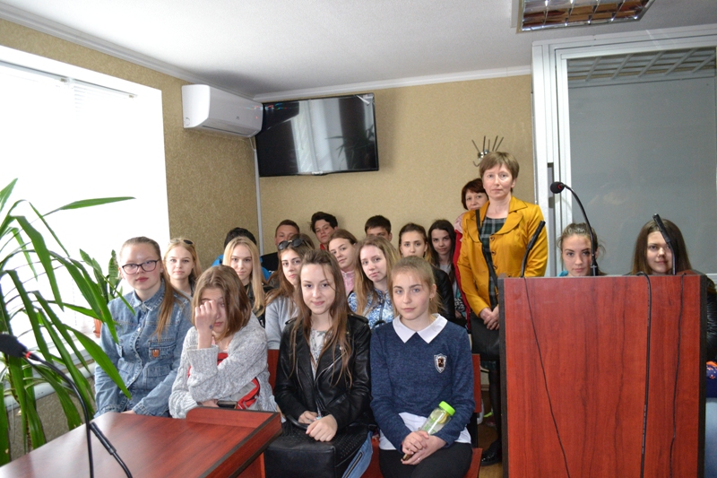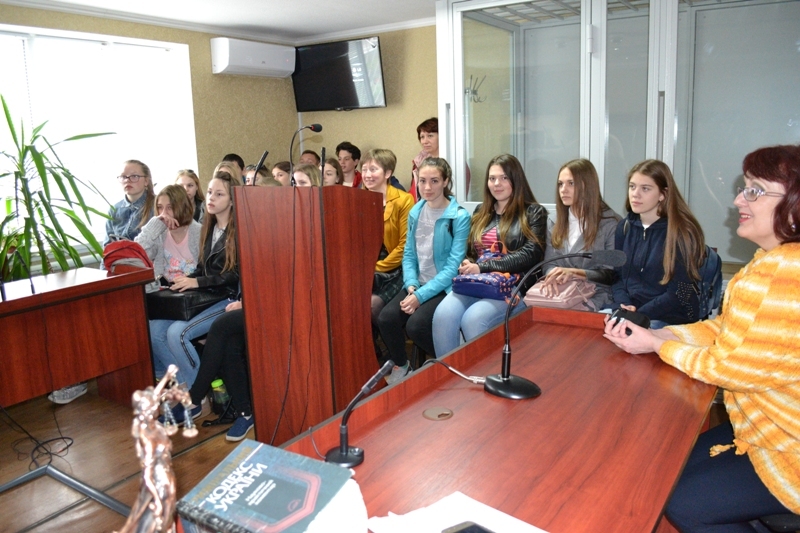 Гостей зустріла помічник судді (прес-секретар суду) Горбатко Світлана Олексіївна, яка провела невеличку екскурсію приміщенням суду та ознайомила присутніх з планом проведення заходу. Після чого учнів, їх вчителів та гостей було запрошено до зали судових засідань, де вони були присутні у відкритому судовому засіданні по розгляду цивільної справи про встановлення факту перебування особи на утриманні.