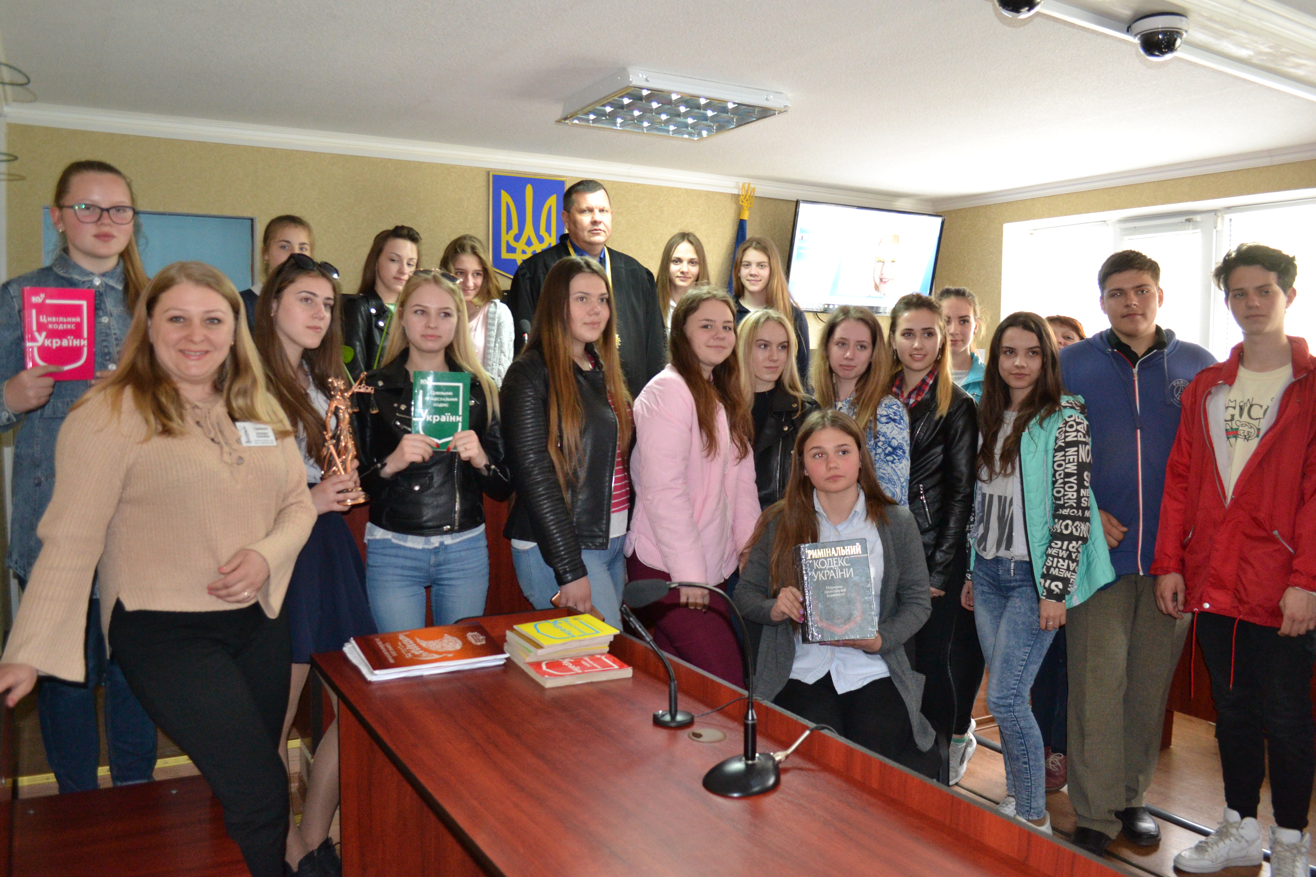 Також помічник судді розповіла про категорії справ, які розглядаються судом та законодавство, що регулює їх розгляд. Коротко ознайомила учнів з основними кодексами України.