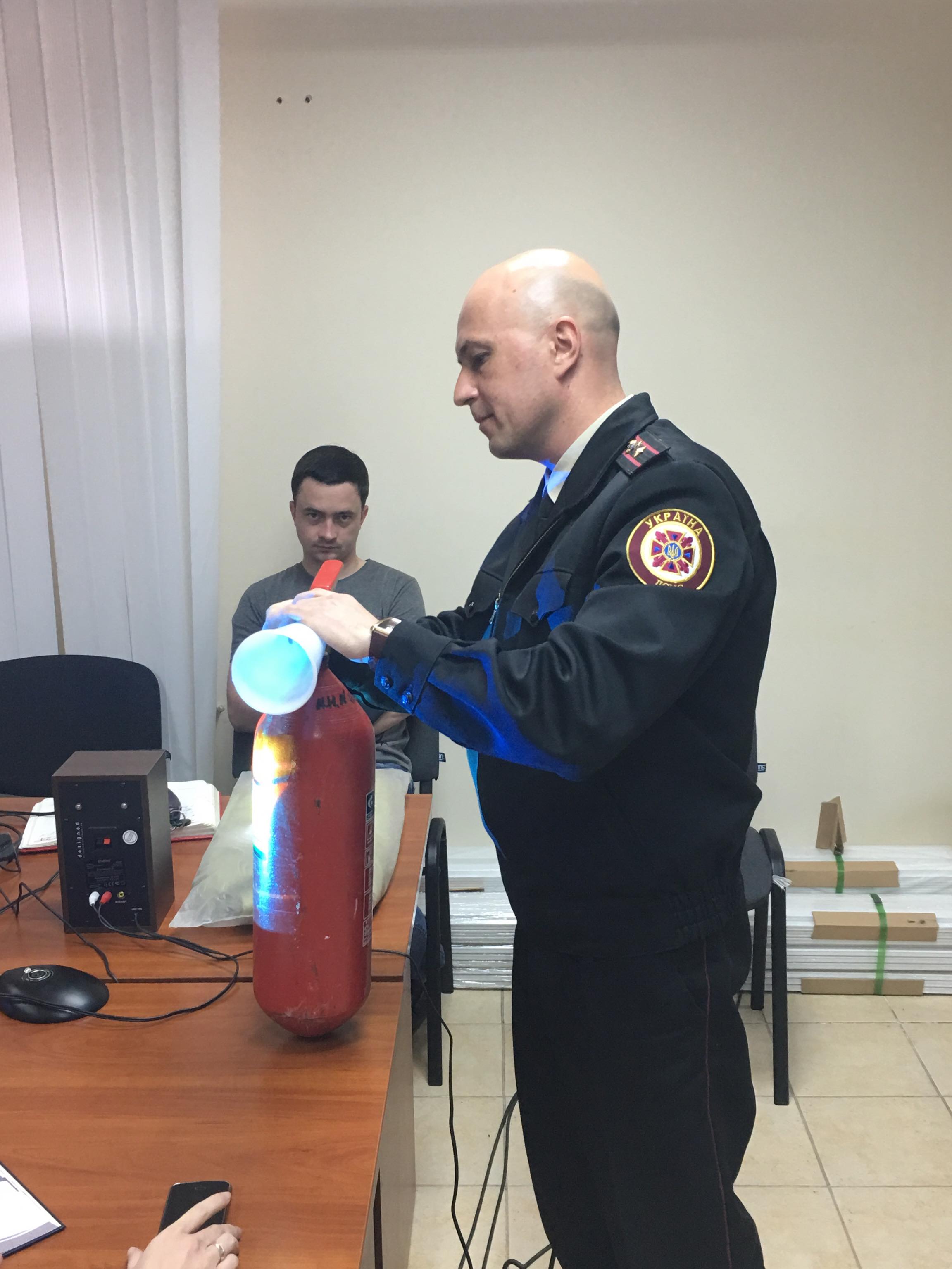 Сергій Вінцюк продемонстрував апарату суду різновиди та способи користування вогнегасниками у приміщенні суду, звернувши при цьому увагу на дотримання заходів техніки безпеки.