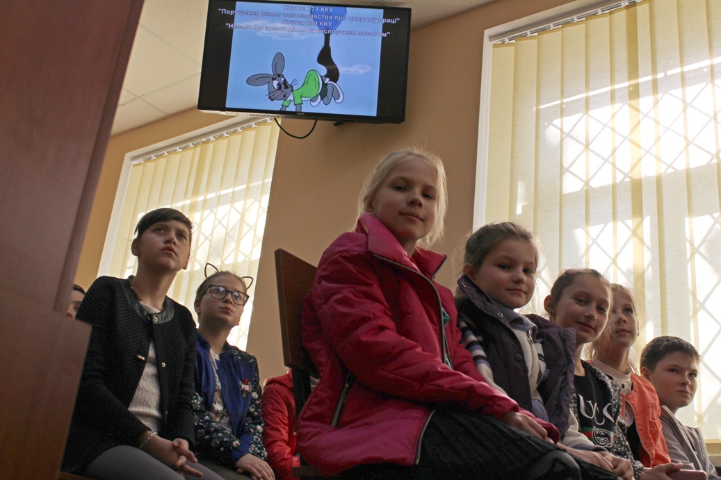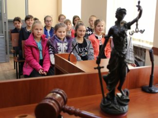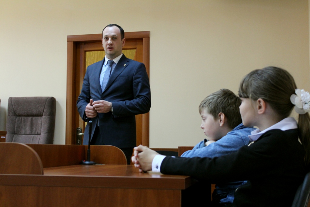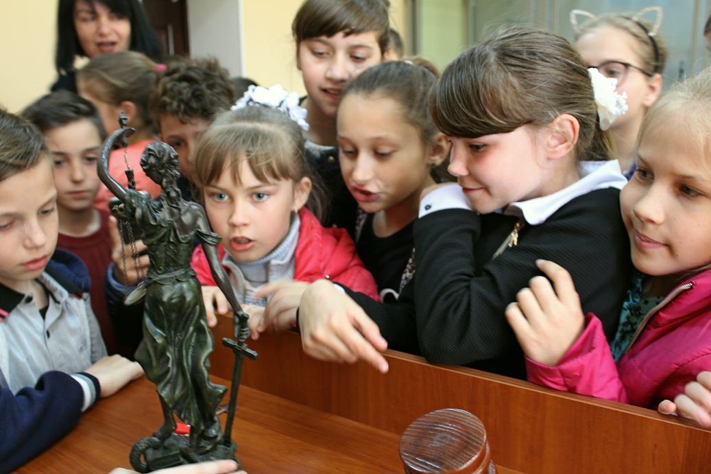 Біля приміщення суду школярів зустріла в.о. прес-секретаря суду Олена Коровіна, яка розповіла дітям про правила поведінки в суді та запросила дітей до залу судового засідання. У залі судового засідання в доступній для дітей формі відбулася цікава бесіда стосовно прав дітей. Діти подивились відеоматеріал стосовно правопорушень, та відповіли на питання.