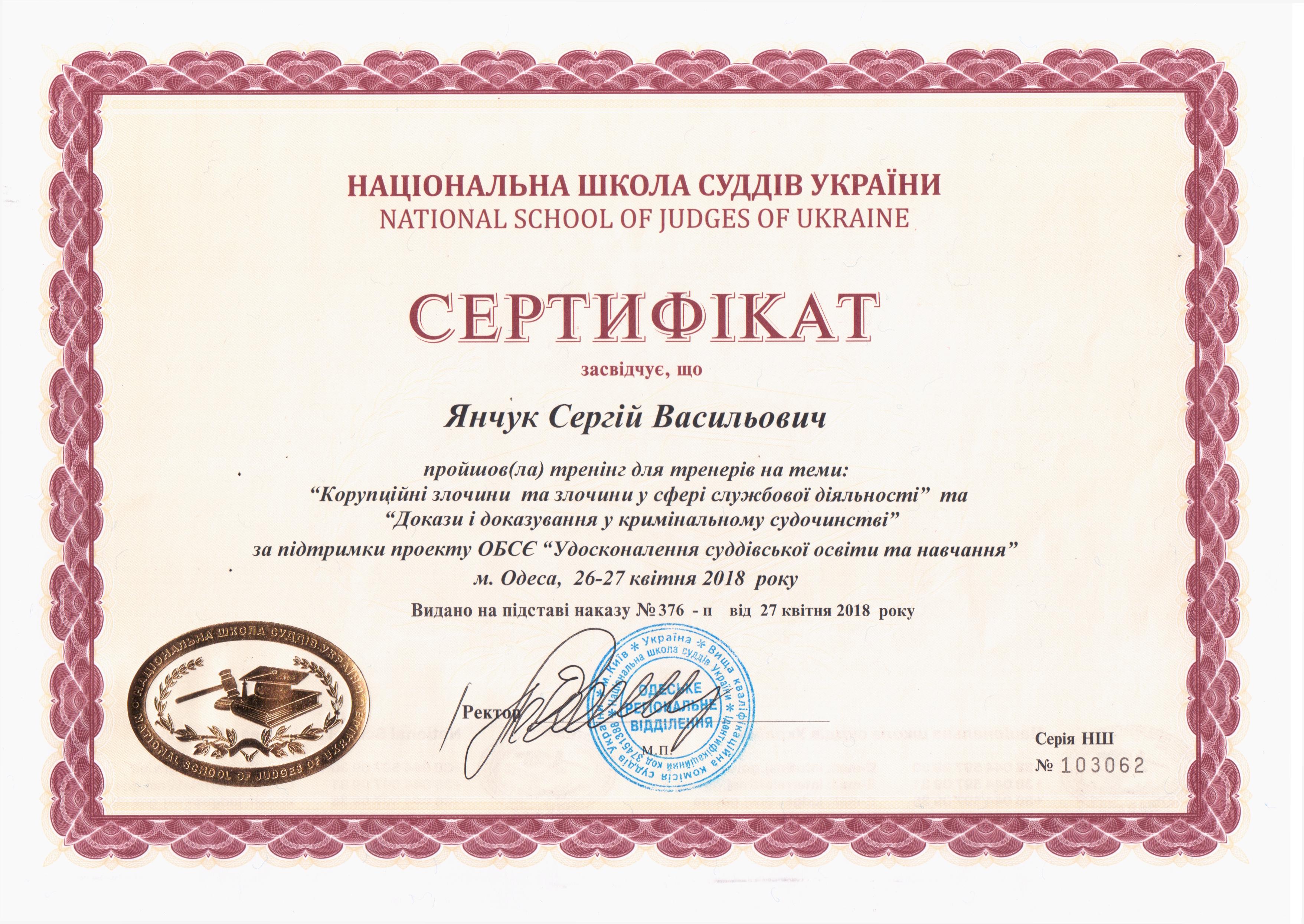 26-27 квітня 2018 року голова суду Сергій Васильович Янчук прийняв участь у тренінгу для викладачів (тренерів), які будуть задіяні в навчальному процесі для кандидатів на посаду судді, на теми: “Корупційні злочини та злочини у сфері службової діяльності” та “Докази і доказування у кримінальному судочинстві”. Захід проводився Національною школою суддів України за підтримки проекту ОБСЄ “Удосконалення суддівської освіти та навчання” у місті Одесі.