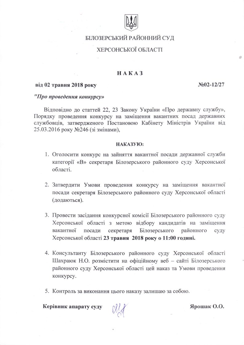 наказом керівника апарату Білозерського районного суду Херсонської області