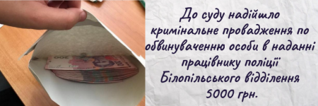 Для інформації: особа обвинувачується в тому, що 28 березня 2018 року близько 10 години Г. прибув до Білопільського відділення поліції Сумського відділу поліції Головного управління Національної поліції в Сумській області, де в службовому кабінеті висловив пропозицію щодо надання грошових коштів за те, що слідчий прийме завідомо незаконне рішення про припинення кримінального переслідування та закриє розпочате відносно нього кримінальне провадження за ч. 1 ст. 191 КК України, та у подальшому надав слідчому неправомірну вигоду в сумі 5000 грн., поклавши гроші всередину службового блокноту, що лежав на робочому столі працівника поліції.