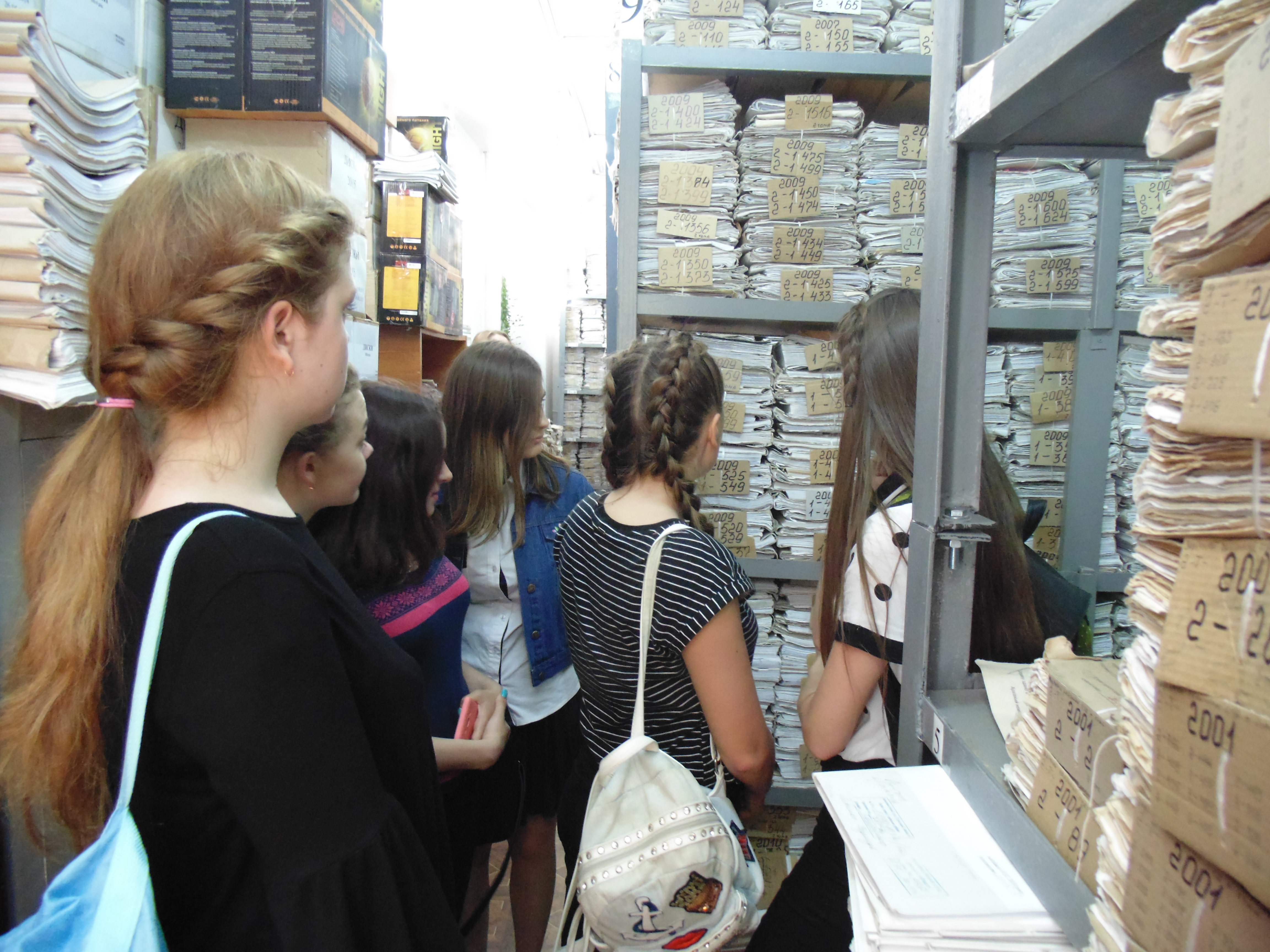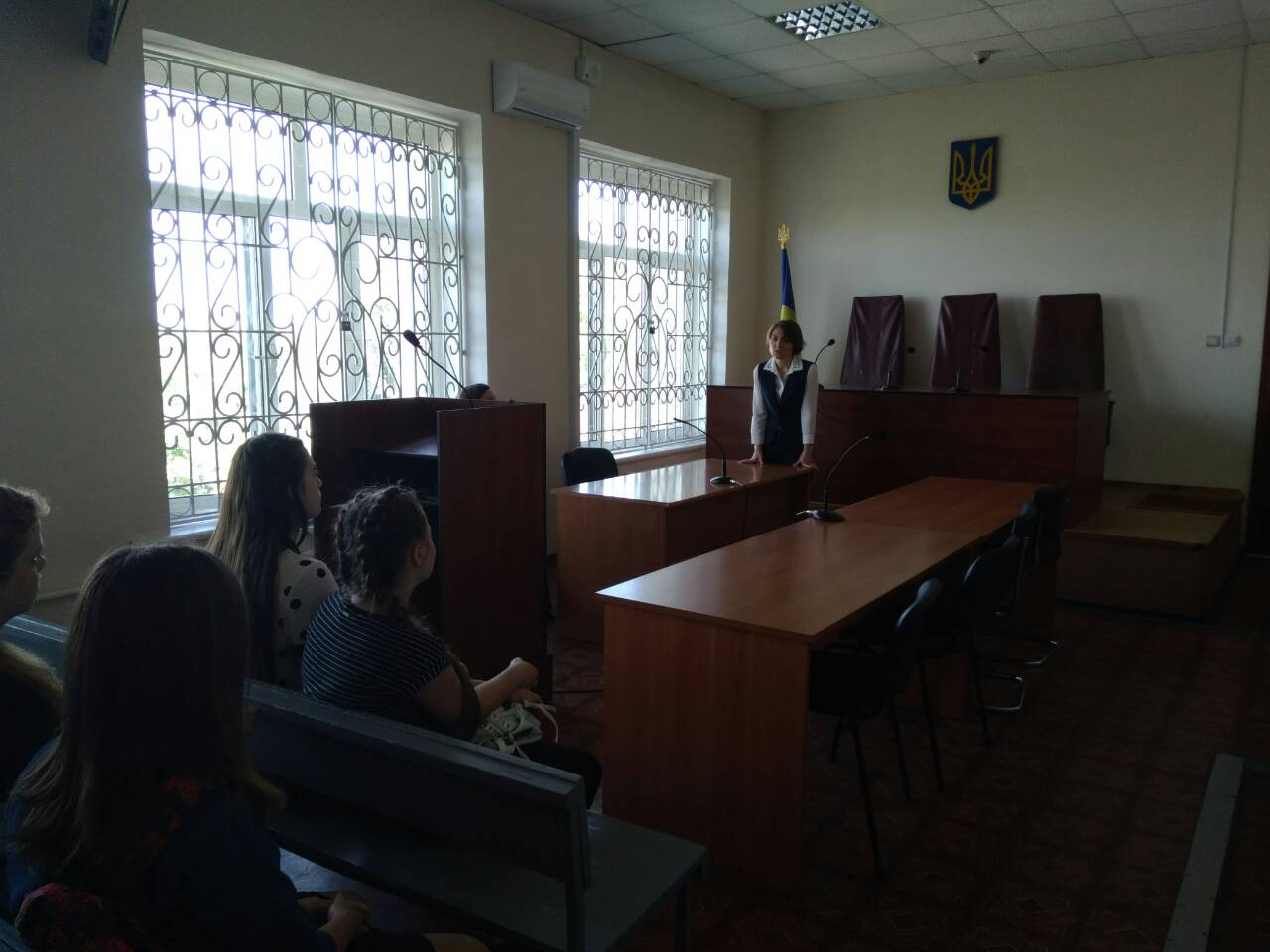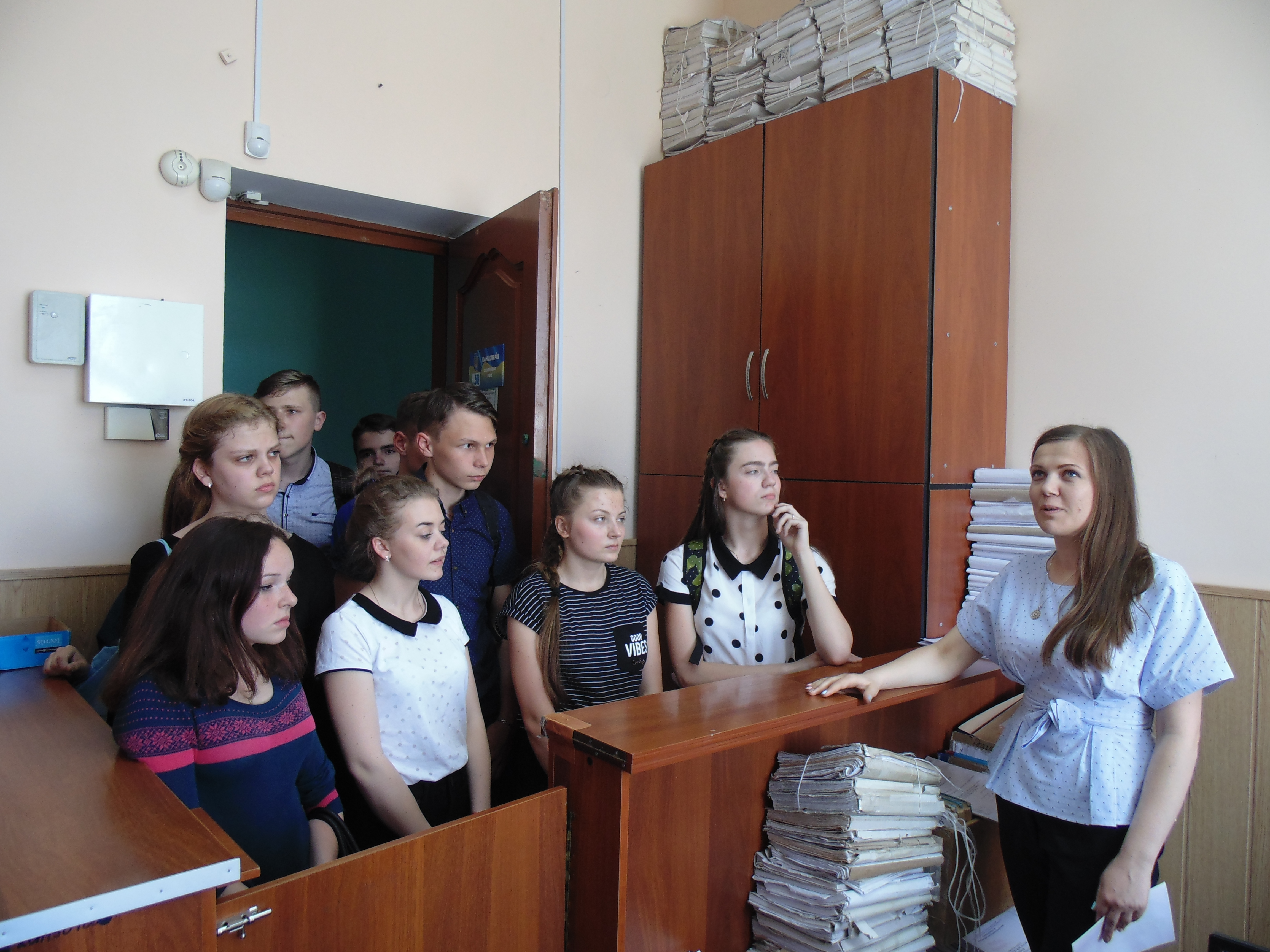 Зустріла учнів в.о. керівника апарату суду Ольга Шаповал, яка провела екскурсію для школярів. Разом відвідали архів суду та канцелярії, потім відвідувачів запросили до залу судового засідання. Ольга Шаповал у доступній для учнів формі розповіла про принципи роботу нашого суду.