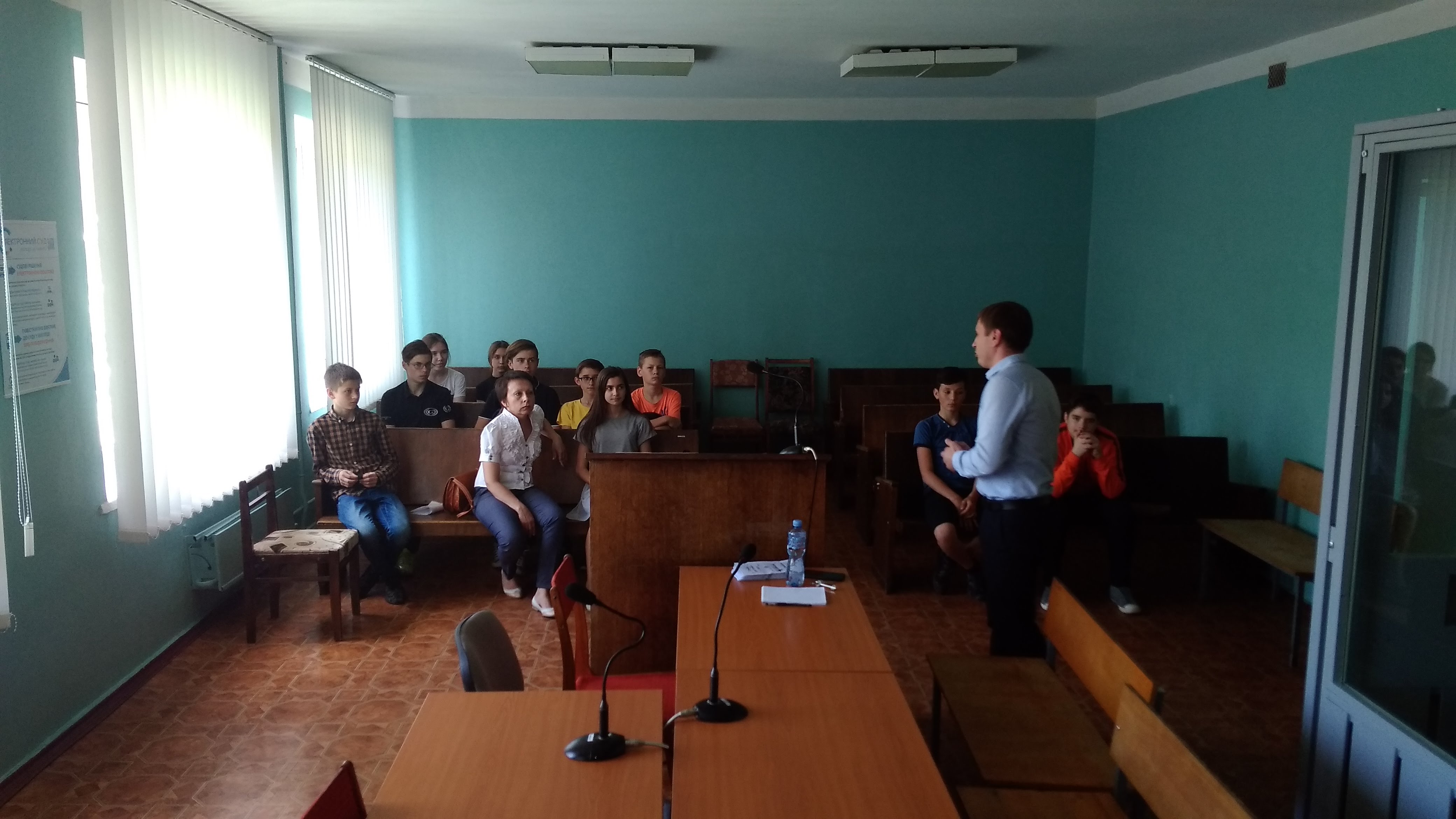 Школярі були запрошені до залу судового засідання, де з ними спілкувався суддя - спікер Городівський Олександр Андрійович. Він розповів про діяльність та структуру суду, ознайомив з можливістю проведення судових засідань у режимі відеоконференції. Продемонстрував як саме проводиться відеоконференція, як в суді досліджуються відео докази.