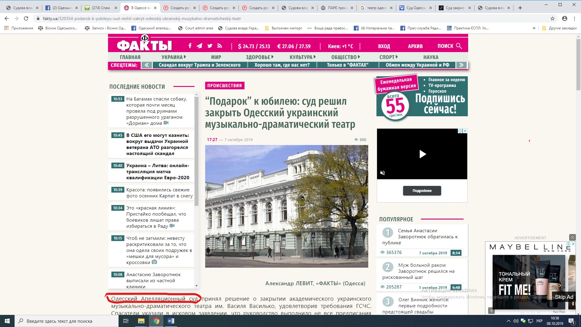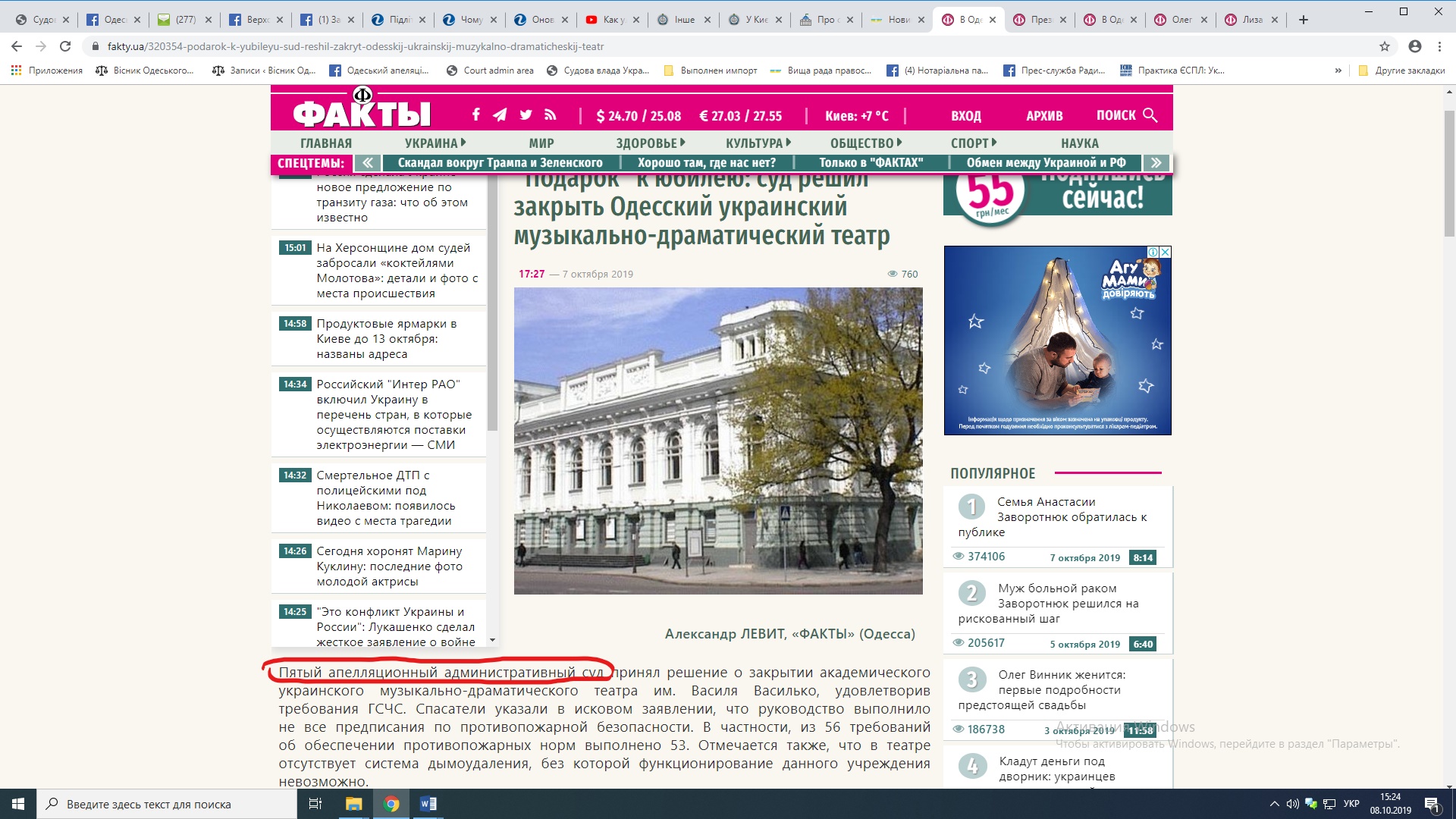 З моніторингу публікацій ЗМІ стало відомо, що інтернет-видання «Факти-Україна» учора, 07 жовтня 2019 року, на своїй веб-сторінці розмістило публікацію під заголовком «Подарок к юбилею: суд решил закрыть Одесский украинский музыкально-драматический театр» (посилання)